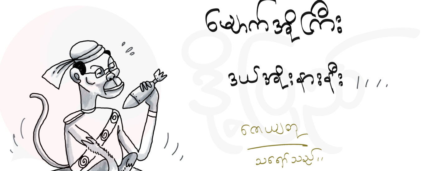 “ဟာ ဆာဇေတို့ကတော့ပြောရော့မယ် မထော်မနန်းတွေ။ ကျနော်ဆိုလိုတာက အခုလတ်တလော ပလ္လင်ပေါ် ထီးဖြူမိုးပြီးဘာညာသာရကာ ဝါစာကမာလုပ်နေတဲ့ မယ်တော်တွေ၊ဘိုးတော်တွေ စတီးလက်ကောက်သံတညံညံဖြစ်နေတဲ့ ကိစ္စတွေလေဗျာ”