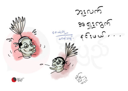 “ဟုတ်ပ မောင်မှတ်ရာ။ အခု မအလရကပကြီးက မဲဆွယ်ရက်တွေဘာတွေချပေးလိုက်ပြီ၊ မဲဆွယ်ဟောပြောတဲ့အခါ စောက်တပ်မကောင်းကြောင်းမပြောရဆိုတာအဓိကအချက်ဆိုပဲ။ ပြောခဲ့ရင်လာထားအာဘွားပဲတဲ့။ အဲဒီတော့ ကစလ အလောင်းတွေက အဆိုကျော်တွေလို “မင်ဂါဘား အဲ့လယ်” ဆိုပြီး ပြန်ဆင်းလာရမယ့်သဘော”