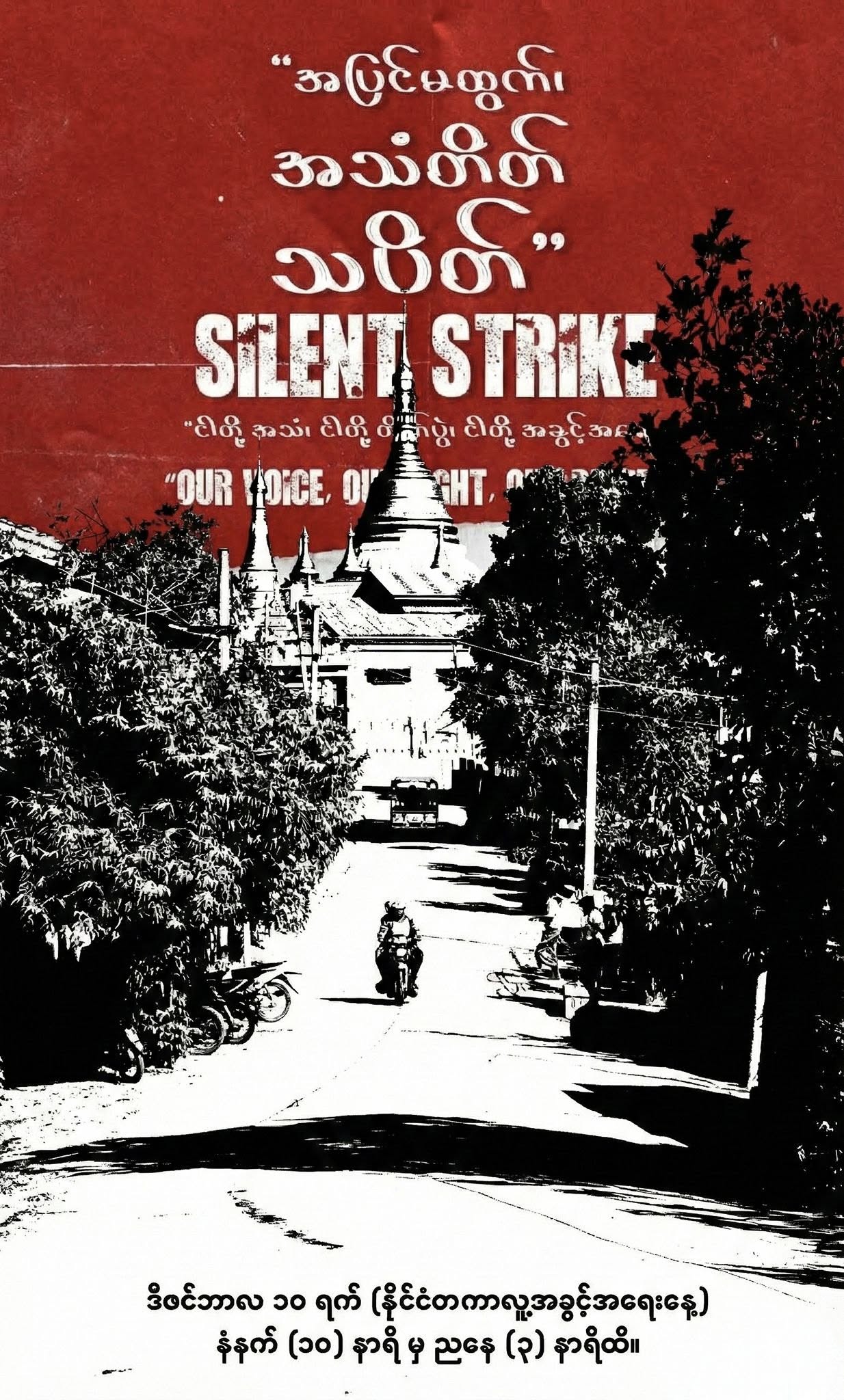 လာမယ့် ဒီဇင်ဘာဆယ်ရက်နေ့မှာ အိမ်ထဲကအိမ်ပြင်မထွက်ကြေး နိုင်ငံလုံးကျွတ် အသံတိတ်သပိတ် silent strike ပြုလုပ်မှာဖြစ်ပြီး မင်းအောင်လှိုင်ပြုလုပ်မယ့် ရွေးကောက်ပွဲဟာ ပြည်သူ့ဆန္ဒမပါတဲ့ အလိမ်အညာ ရွေးကောက်ပွဲဖြစ်ကြောင်း မြန်မာလူထုတစ်ရပ်လုံးဟာ ရွေးကောက်ပွဲကို အယုံအကြည်ကင်းမဲ့ကြောင်း တစ်ကမ္ဘာလုံးက သိသွားစေဖို့ရည်ရွယ်တယ်လို့ ဆိုပါတယ်။