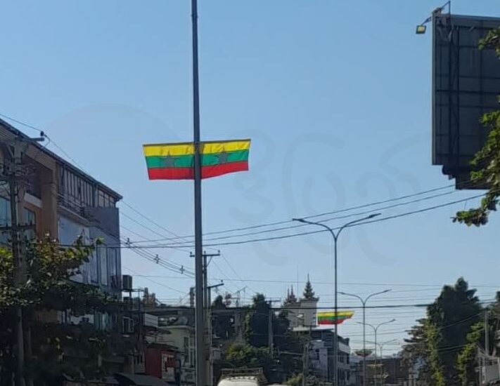 ပုံစာ- ပြည််မြို့ဗိုလ်ချုပ်လမ်းမှာ နိုင်ငံတော်အလံများချိတ်ဆွဲထားတာကို ဒီဇင်ဘာ လ ၂၇ ရက်နေ့ကတွေ့ရစဉ်